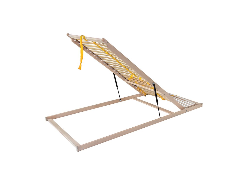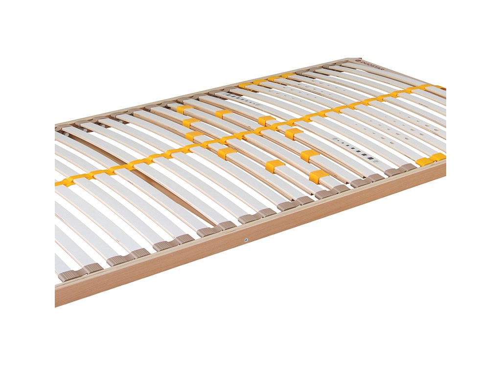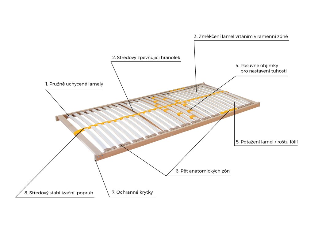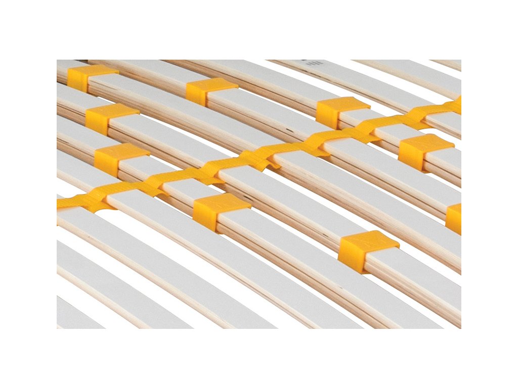 Postelový rošt s výklopem nožní části pomocí pístu s přístupem do celého úložného prostoru. Zdvih pomocí textilního úchytu usnadní každodenní manipulaci. Pružné lamely uložené ve dvojicích v kaučukových pouzdrech jsou rozložené do 5 anatomických zón. Vrtané lamely v ramenní oblasti zajišťují nižší tuhost a zmírňují tak tlak na ramena. Středový popruh zlepšuje stabilitu a nosnost roštu. Posuvnými objímkami lze nastavit individuální tuhost v bederní části. Lamely opatřené fólií mají schopnost zachytávat pod matrací méně prachu, zamezují zatrhávání potahu matrace a přenášení vlhkosti z matrace do roštu, což je plus, které ocení především lidé s alergií.