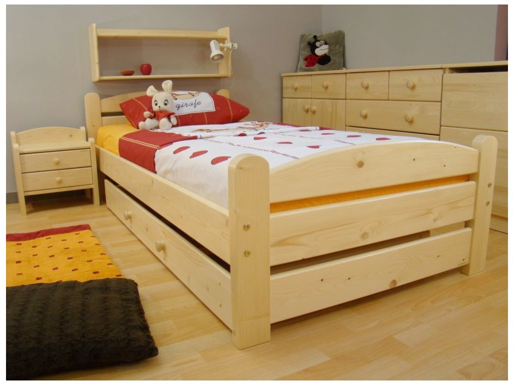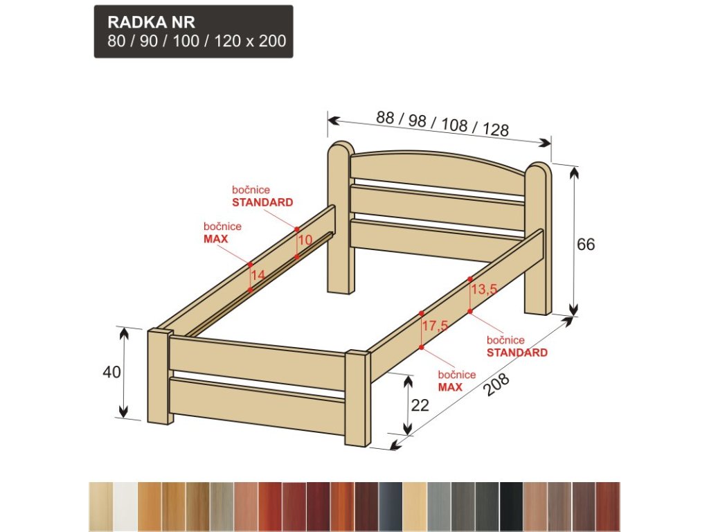 Dřevěné jednolůžko ze smrkového masivu RADKA NR s bočnicemi STANDARD je skvělá bytelná postel z masivu pro děti i dospělé. Postel RADKA NR je robustního vzhledu, pro svoji pevnou konstrukci a silný materiál je toto masivní jednolůžko velmi vyhledávané. Varianta dřevěné postele RADKA NR je určena pro zákazníky vyžadující u postele nízké čelo u nohou pod matraci. Dřevěná postel z masivu RADKA NR vynikne v každém dětském i studentském pokoji. Tato postel z masivu má všechny hrany i rohy zakulaceny pro maximální bezpečnost.