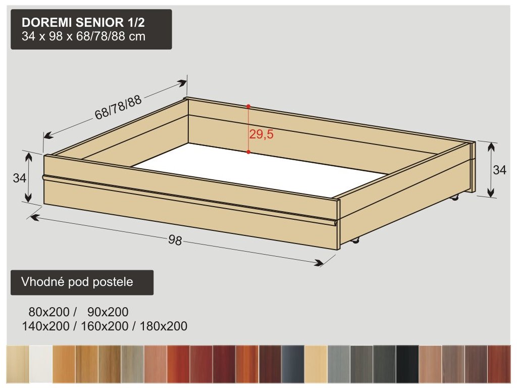 Velikost: 34 x 98 x 88 cm (v x š x h) - k postelím šíře 90, 100 i 120 cm - jednotná velikost, pod celý prostor lůžka zadejte 2ks zásuvky Doremi 1/2